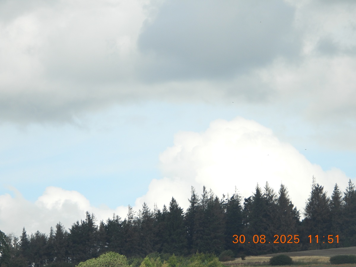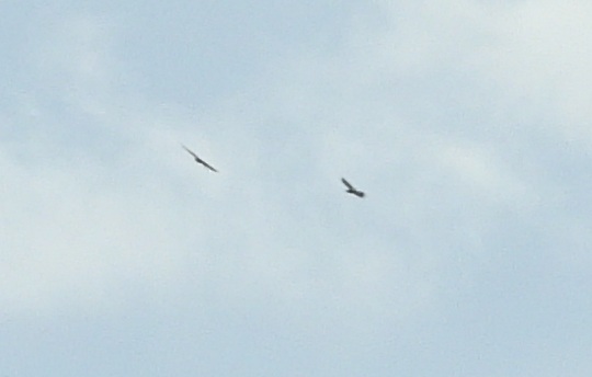 September 28th: maximum 15C, minimum 2C, light W, sunny all day, dry. Back to business in the sunshine with further watch over my home ground, the Devil’s Water, from 10:00-15:30. There was regular calling from 2 Common Buzzard adult in the valley but they kept in cover for nearly all of the time; a juvenile Kestrel was over my field late afternoon. At Slaley W, a palish juvenile Honey-buzzard was soaring at 12:32 1 2 3 4, clearly a migrant and departing S, escorted initially by a Black Kite juvenile. This Black Kite 1 seems to regard it as its duty to escort every migrating Honey-buzzard out of its area so when another darker Honey-buzzard juvenile appeared soaring at 12:36 5, it transferred its attention to this one, soaring quite high above it at times (15195). So 2 Honey-buzzard juvenile S and Black Kite juvenile still here: a very good morning’s work! A Common Buzzard was also at Slaley W. Insects included a queen wasp looking for hibernation position 1 and 4 types of butterfly: 2 Small White, single Large White, Red Admiral, Speckled Wood. Other birds were a feeding Redwing, 2 Siskin W, 2 Chaffinch W, 6 Tree Sparrow, 2 singing Robin, tit flock comprising 8 Long-tailed Tit, 4 Goldcrest, 3 Coal Tit, 3 Blue Tit. Mowed grassy area leading into orchard and started a path towards the far pond: 2.5 bales in all but hard work with the path in the field; will continue with that 2moro. In evening made final night of Festival, hearing songs from Cole Porter at QH with Clare McCaldin, mezzo soprano; Paul Sheehan, baritone; and Stephen Dickinson, piano. All went well. Then straight to G4g4s to meet gang with L/C on!! We had gr8 chat! Added some images to Brundibár Arts Festival events and artists web pages. Missing my late night outings!! XXX